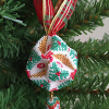 Materials: All size 11/0 cylinder beads (Delicas) in 4 colours, 1 superduo bead, 1 spacer bead, cord or ribbon, a red tassel and/or chime bead for the inside (optional).