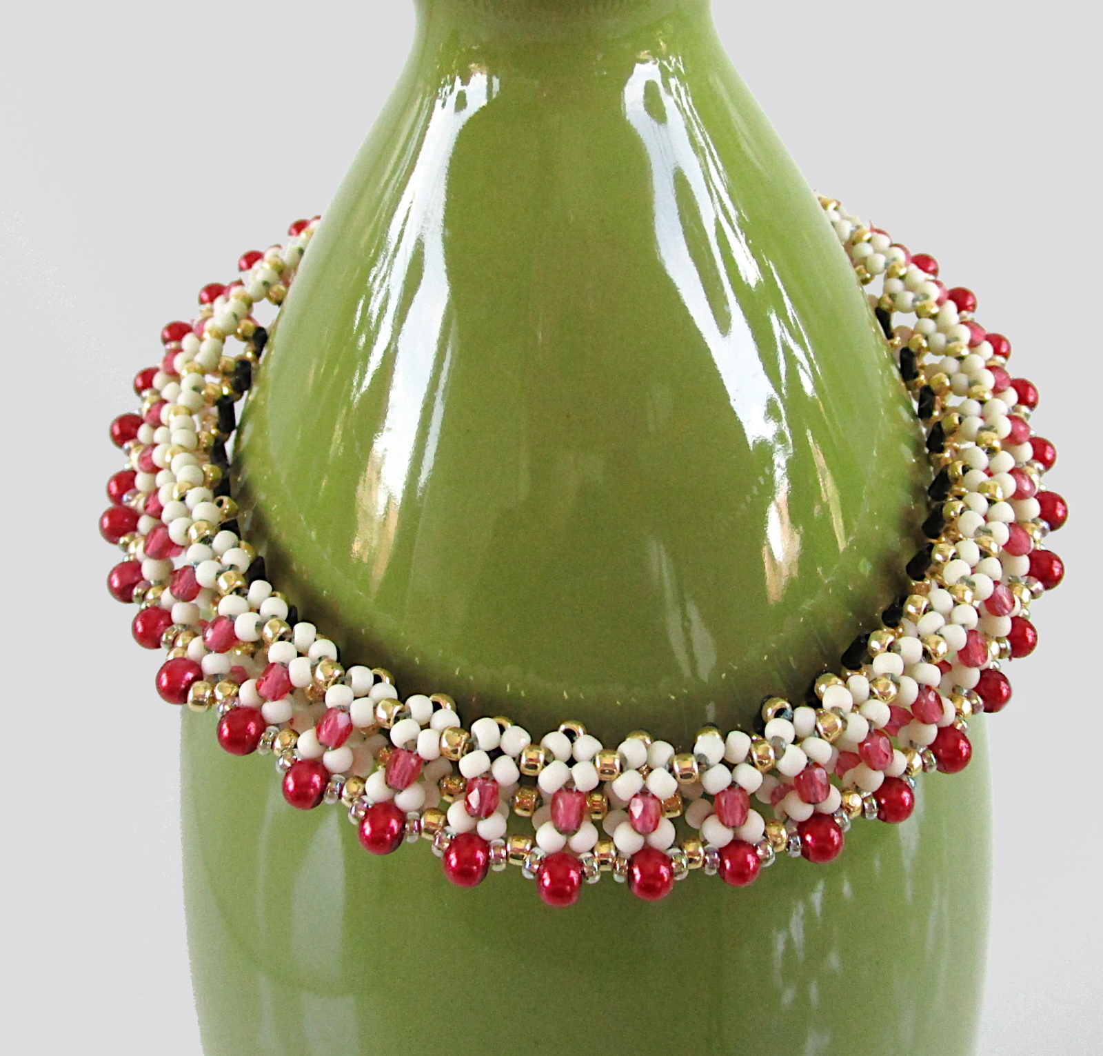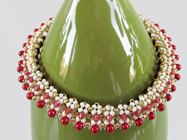 Materials: seed beads in size 11°, 15°, bugle beads, glass pearls, fire-polished beads.